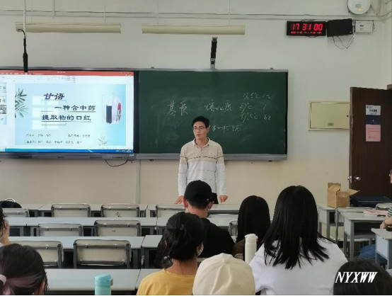 学院副院长文友民、与会教师为每位学生们赠送中医学院大学生创新创业产品——含中药提取成分的口红“甘语”。该项目研发团队主要参与者杨洋、宗涛同学分享了依托“挑战杯”“互联网+”竞赛平台,研发产品的全过程,号召同学们积极加入到创新创业中来,一起崇尚科学、追求真知、勤奋学习、锐意创新、迎接挑战,成为勇挑时代重担的新时代青年。茆春阳老师介绍了“互联网+”等创新创业比赛的竞赛要求、赛事章程及历年成绩,鼓励大家要勇于尝试,不要害怕失败,要将所学所思所想融入生活,展现新时代青年学生的科创智慧和风采。