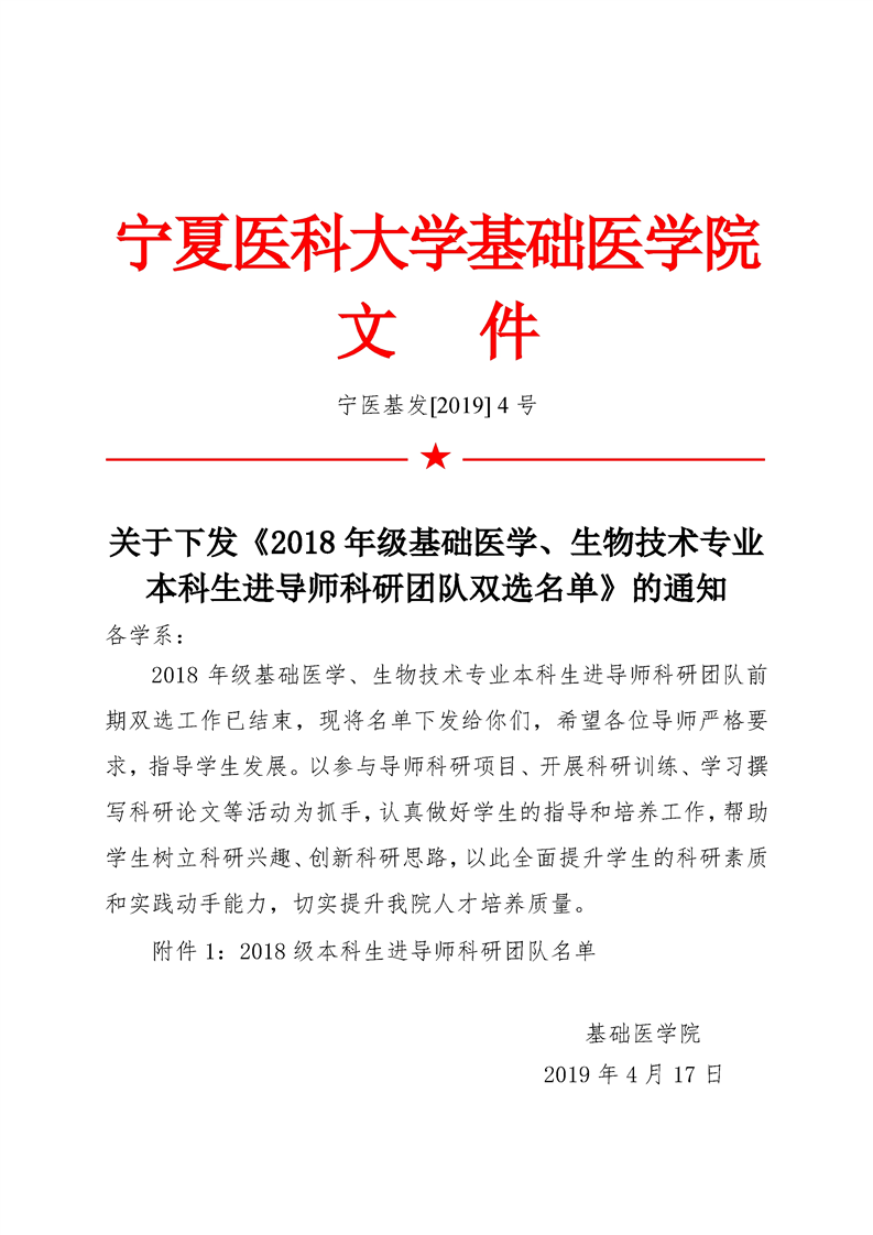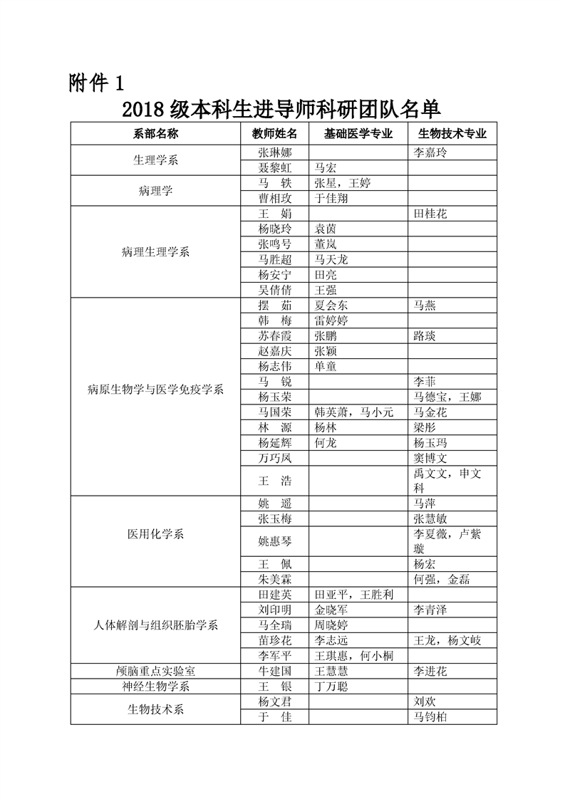 2018级基础医学、生物技术专业本科生进导师科研团队双选名单