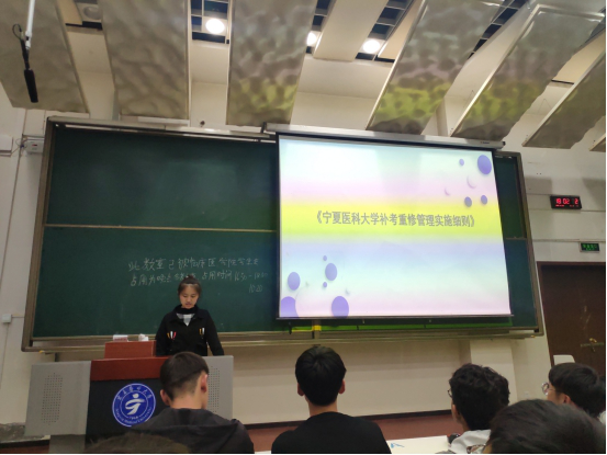 为了贯彻执行新修订的《宁夏医科大学补考重修管理实施细则》,提高学生对细则的理解认识和对课程学习的重视,基础医学院利用10月20日晚点名,在应谦楼103教室进行《宁夏医科大学补考重修管理实施细则》讲解,学院全体本科生参加。