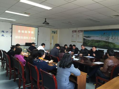 会上,首先孙玉宁副院长传达了教育部,宁夏教育考试院及我校关于2017年研究生招生复试工作的相关会议精神,宣读《宁夏医科大学2017年硕士研究生复试工作实施办法及细则》,及《基础医学院2017年硕士研究生复试工作实施办法及细则》。通报了今年学校及我院今年研究生报考及初试的整体情况,同时对我院今年的研究生招生复试工作进行了部署和安排,要求各学位点严格按照会议精神,认真履行复试工作,规范复试各个环节,做到公平、公正、公开、择优录取的原则。杨怡常务副院长、柯亨宁院长先后发言,要求学院上下严把复试关,保持复试流程顺畅严谨。最后,周永伟书记指出面对2017年我院研究生招生复试工作的新变化和新形势,要求各学位点务必高度重视,要熟知程序、熟知形势、熟知责任,坚持原则,实事求是,各学位点负责人作为复试小组的第一责任人,应严把复试关,保证招生复试各项工作顺利进行。