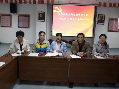 2015年4月27日上午,病原生物学与免疫学党支部在基础医学院“党员之家”召开了“守纪律讲规矩”学习活动。党支部全体党员认真学习了习近平总书记十八届中央纪委五次全会上的讲话,明确了党的规矩和党的纪律。懂得并自觉遵守这些规矩,个人才能不触雷、不踩线,党才更有凝聚力、战斗力。学习中,赵瑞教授指出:从我党成立那天就强调纪律问题,“三大纪律八项注意”、“反对自由主义”等是保证党的先进性和战斗力的根本保证。各位党员立足岗位畅谈了党员的先进引领作用,要更好地发挥表率作用必须要加强纪律建设,把守纪律讲规矩摆在更加重要的位置。学习在热烈的讨论气氛中结束,各位党员坚定表态要做到“严规矩紧纪律,做政治上的明白人”,将我们的事业不断推向前进!