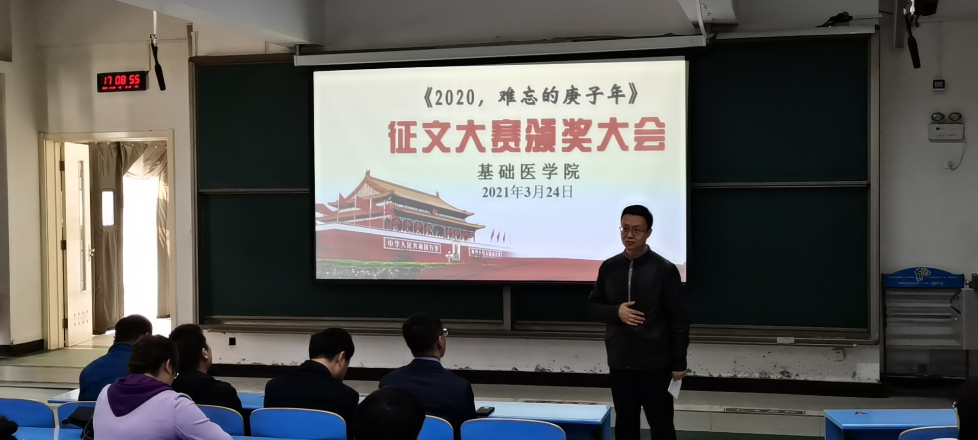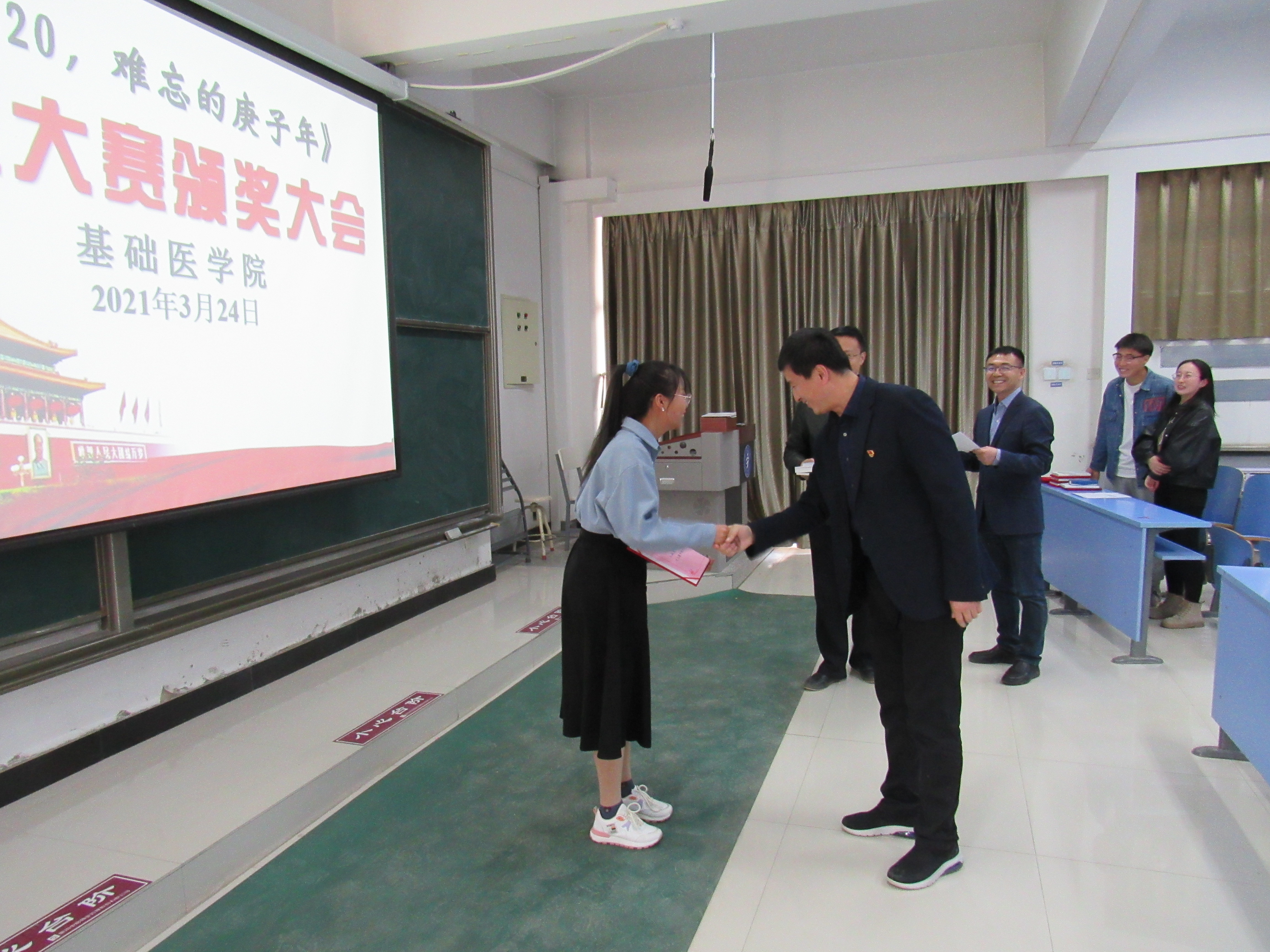 3月24日下午,为迎接建党100周年,铭记抗疫历史,弘扬时代主旋律,由基础医学院秦毅教授名师思政工作室、人体解剖与组织胚胎学系党支部、学生工作办公室联合举办的《2020,难忘的庚子年》征文表彰大会在雁湖校区解剖楼101阶梯教室顺利举行。学院党委副书记马立虎、名师思政工作室秦毅教授、人体解剖与组织胚胎学系主任李军平、党支部书记黑常春及学系师生代表60余人参加了活动,表彰大会由秦毅教授主持。