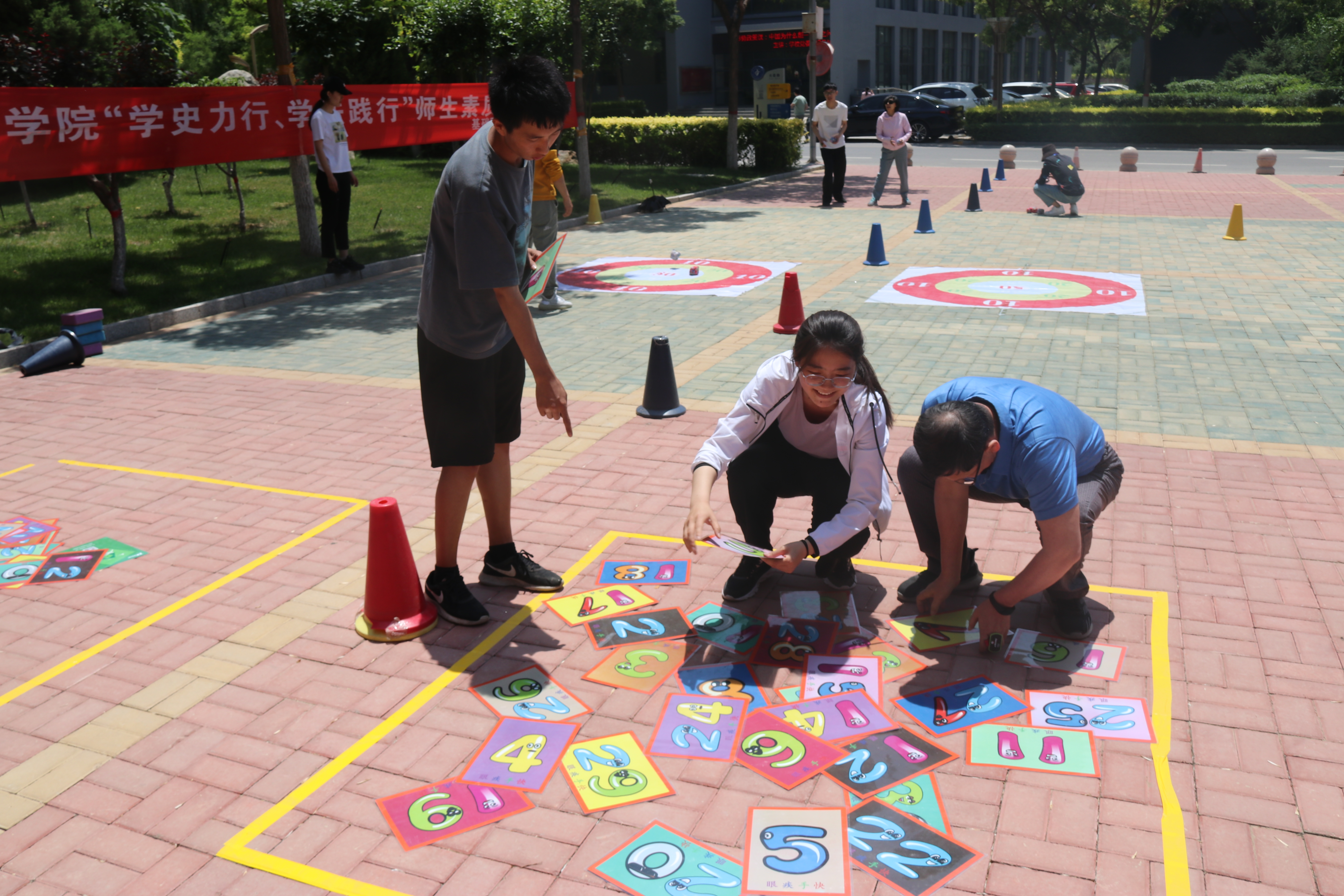 学院党委书记周文韬宣布活动正式开始,拉开了本次比赛的序幕。在工作人员的组织下,参赛师生现场自由组成双人比赛小组,积极有序地参加到比赛中,相互配合、共同闯关。参赛小组需完成定点打卡闯关活动和线上民法典知识答题,以用时最少者为获胜者。闯关活动包括手脚并用、摸石过河、一击必中、眼疾手快,不仅是参赛队员身体素质的比拼,更考验了两个人的配合和反应。活动现场,参赛师生热情高涨、不畏炎热、顽强拼搏。经过紧张激烈的比赛,学院院长刘娟老师和马彩芬同学获得第一名。