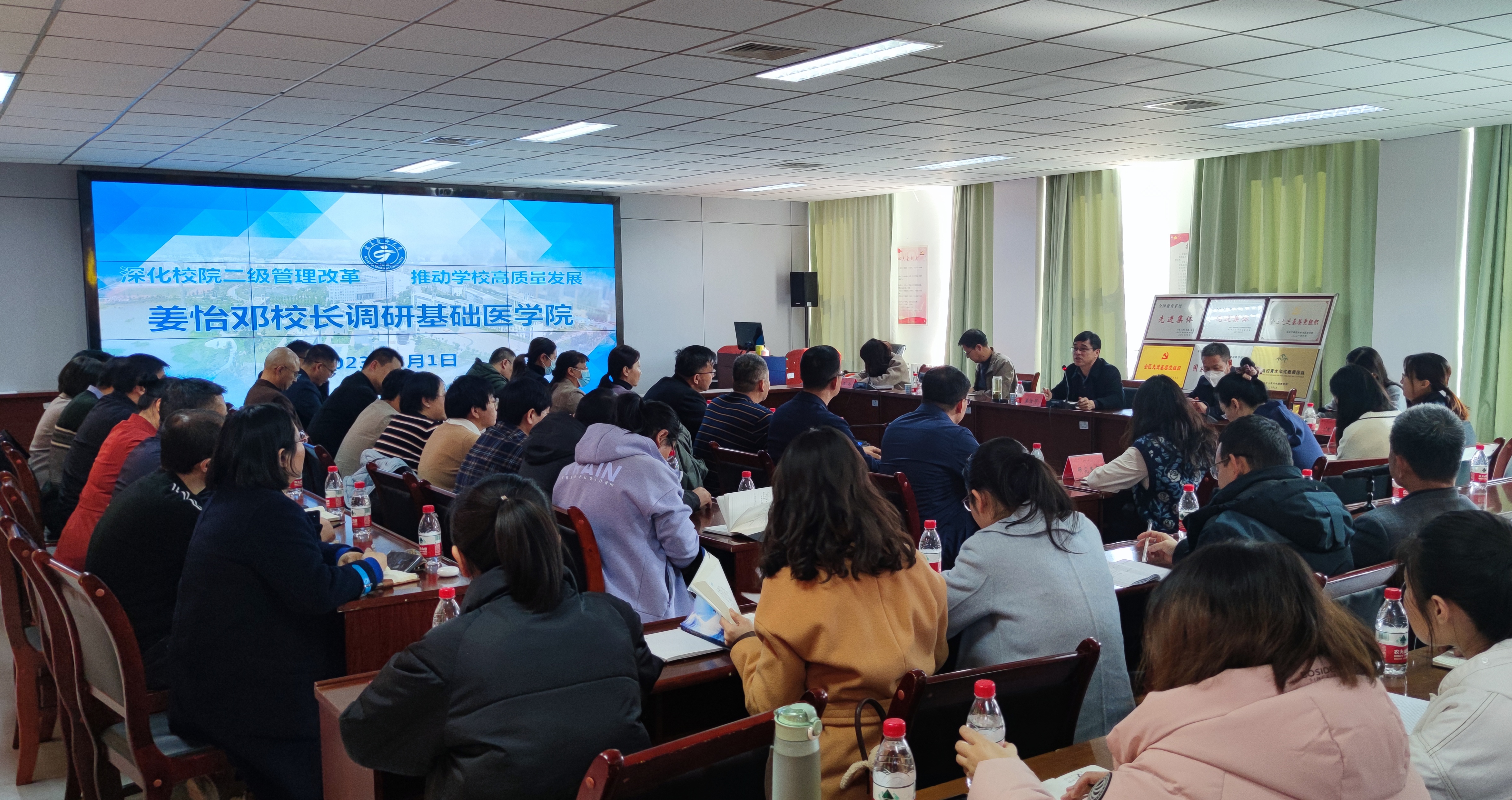 3月1日下午,为进一步深化院校二级管理改革,推动学校高质量发展,学校校长姜怡邓带领深改办一行5人到基础医学院开展调研工作,基础医学院领导班子成员、各行政办公室人员、各学系(中心)负责人及中青年教师代表参加调研座谈会。