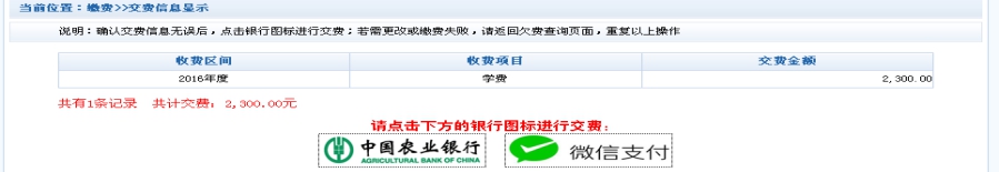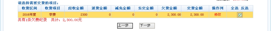二、 登录成功后点击“缴费”,查看欠费信息,勾选需要缴费的项目并核对金额,点击“下一步”,选择“微信支付”,截图保存二维码。每次缴费都要生成新的支付二维码,切记随意扫描他人学号生成的二维码。