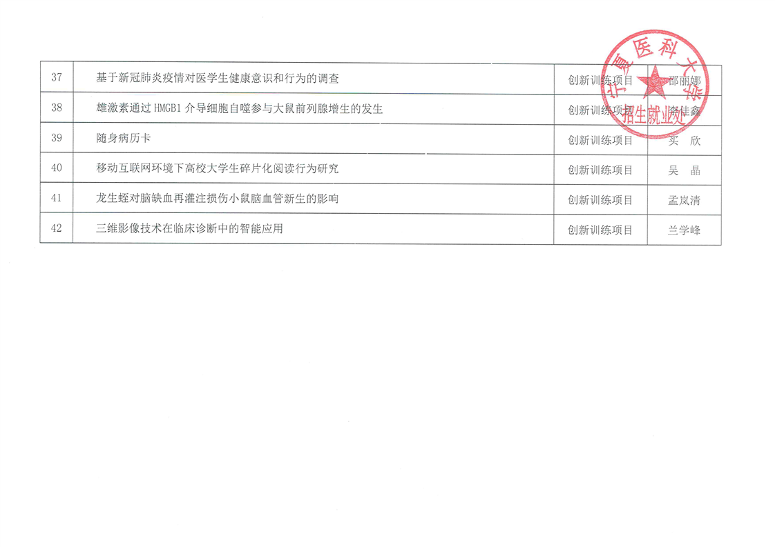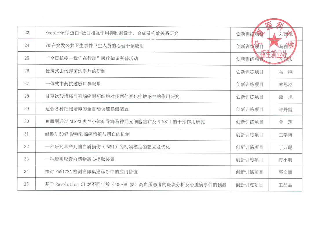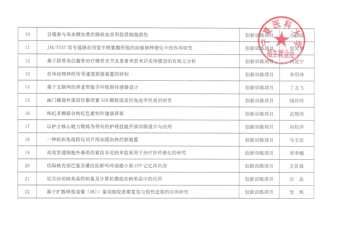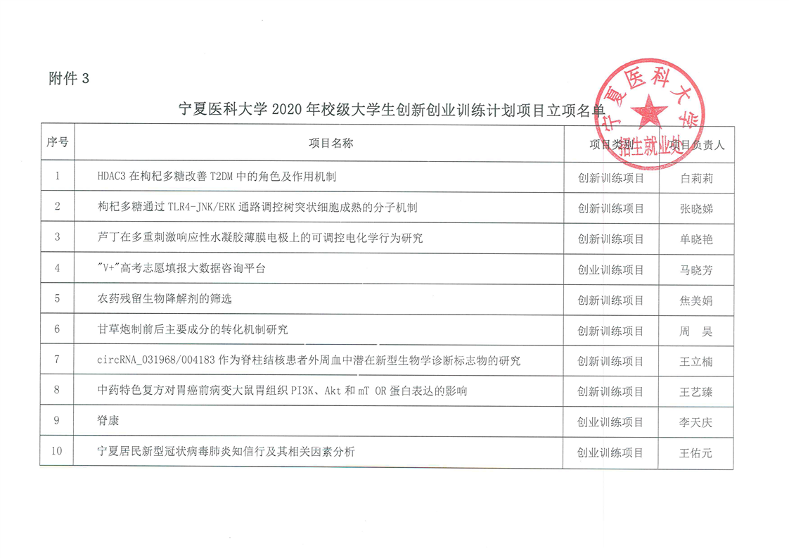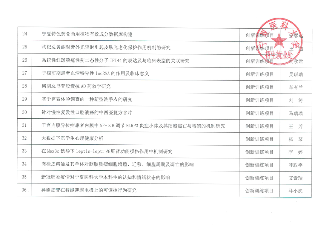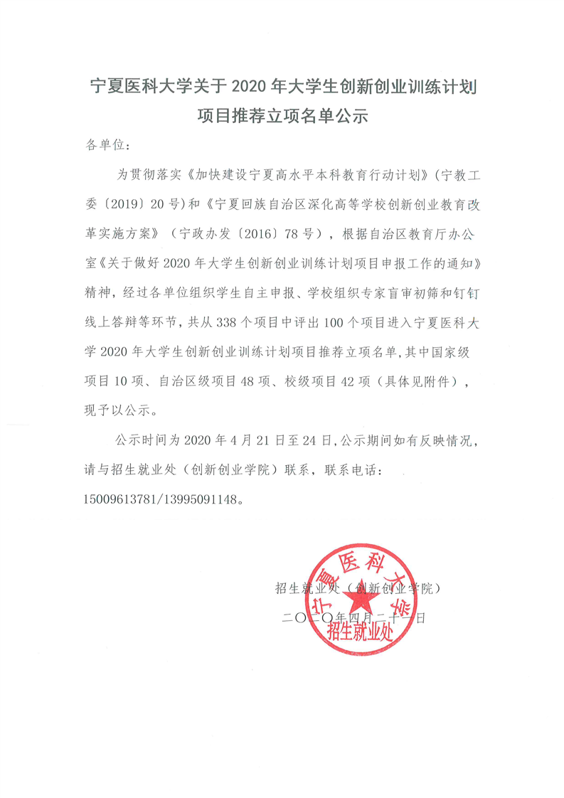 宁夏医科大学关于推荐2020年大学生创新创业训练计划项目推荐立项名单公示