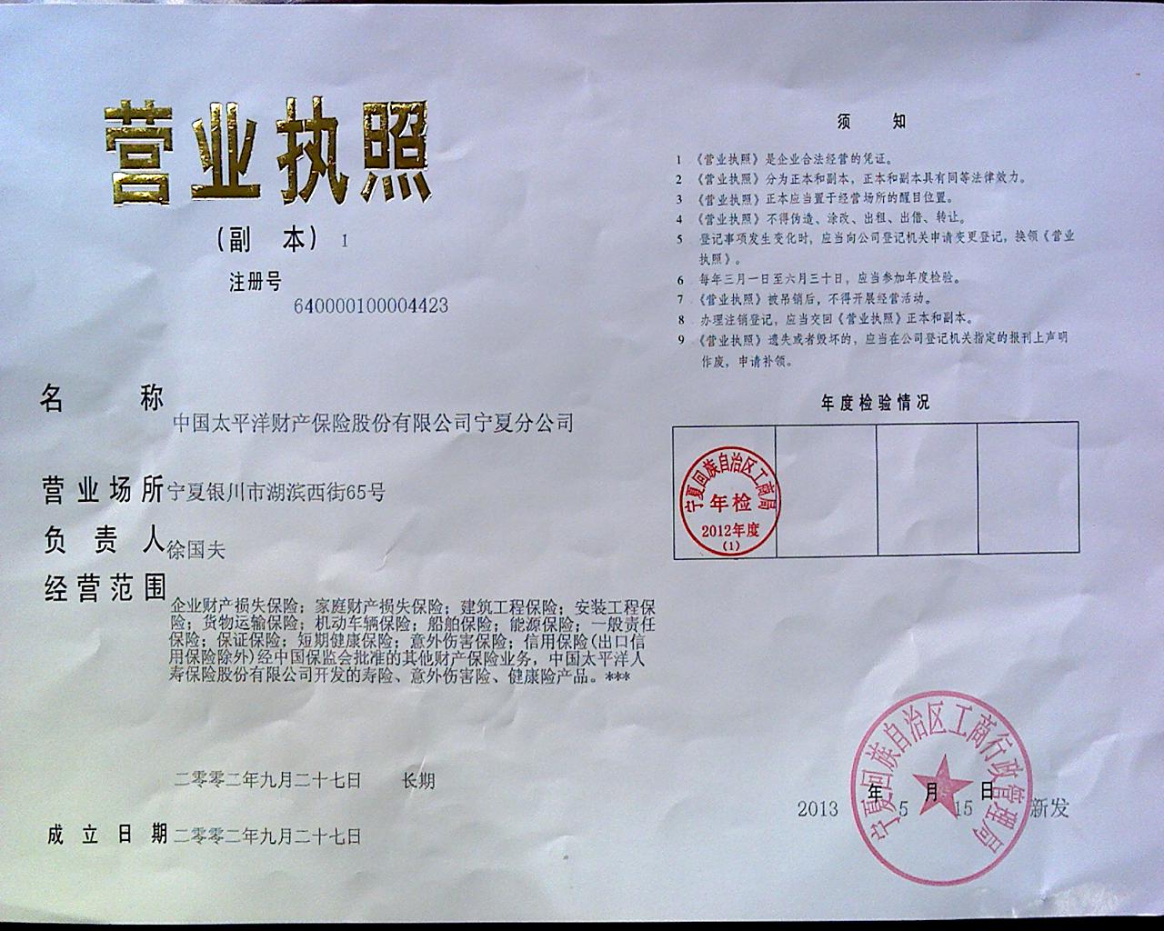 中国太平洋财产保险股份有限公司宁夏分公司于2002年10月25日开业,目前全区下辖11个分支机构,形成了比较齐全的服务网络。公司着力提升服务质量,构建诚信品牌,坚持“诚信天下、稳健一生、追求卓越”的企业核心价值观,始终用真心服务客户,用爱心承担保险责任,在积极追求自身发展的同时,还致力于各类公益事业,积极开展关爱孤残、扶贫赈灾等公益活动,精心打造“一家负责任的保险公司”品牌,全力为构建和谐宁夏保驾护航。公司成立以来为150多名下岗职工提供再就业工作岗位,接收大中专院校毕业生和部队复员军人40多人,有力地支持了宁夏经济建设,并维护了社会稳定,起到了“经济助推器”和“社会稳定器”的作用。
